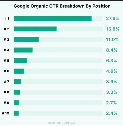 위의 이미지와 같이 상위 3 퍼센트 이하로는 클릭율이 현저히 낮아지고, 가장 상위에 노출되는 첫 번째 사이트가 대부분의 클릭율을 가지고 갑니다. 따라서 콘텐츠를 작성할 때 검색엔진이 좋아하는 구조로 최적화하여, 검색엔진 사용자가 검색을 했을 때 상위 3퍼센트 안에 나올 수 있게 트래픽을 늘려서 결과적으로 매출을 높여야 합니다.